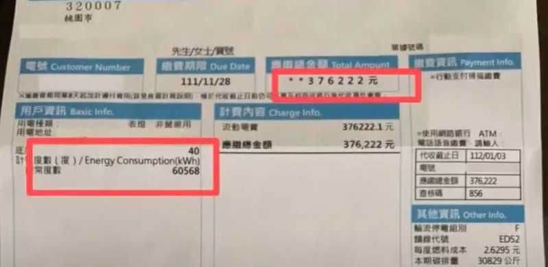 帳單顯示,金額高達37萬6222元,其中詭異的是,三、四樓的用電僅收取100元,但一、二樓的用電卻高達6萬多度,相當於一般四口之家20年的用電量。面對這筆離譜的電費,王女立即向台電提出投訴。