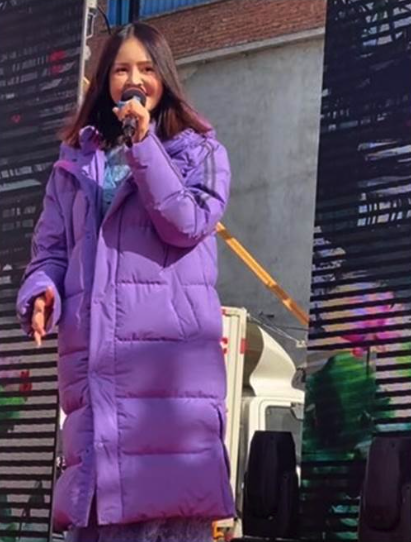 只是因為天氣太冷,在紫色禮服外面套了一件羽絨服,