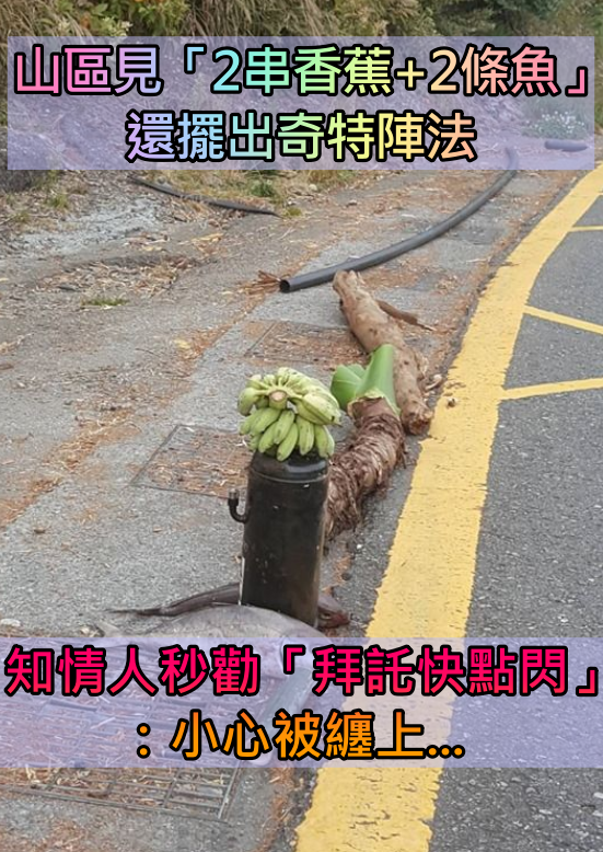 不過也有人推測,可能是在進行某種儀式,「好像是祭祖靈」、「感覺是祭獻給魔神仔」、「也許是祭山神的吧,還是別亂碰」、「快逃,那裡晚上會很恐怖,你會被纏上…魚臭掉會引來一堆蒼蠅纏著你!」甚至還有網友搞笑解讀成暗號,「注意蕉筒(交通)安全,開車眼睛兩側魚光(餘光)要注意突發事況」,讓眾人瞬間全笑翻了。
