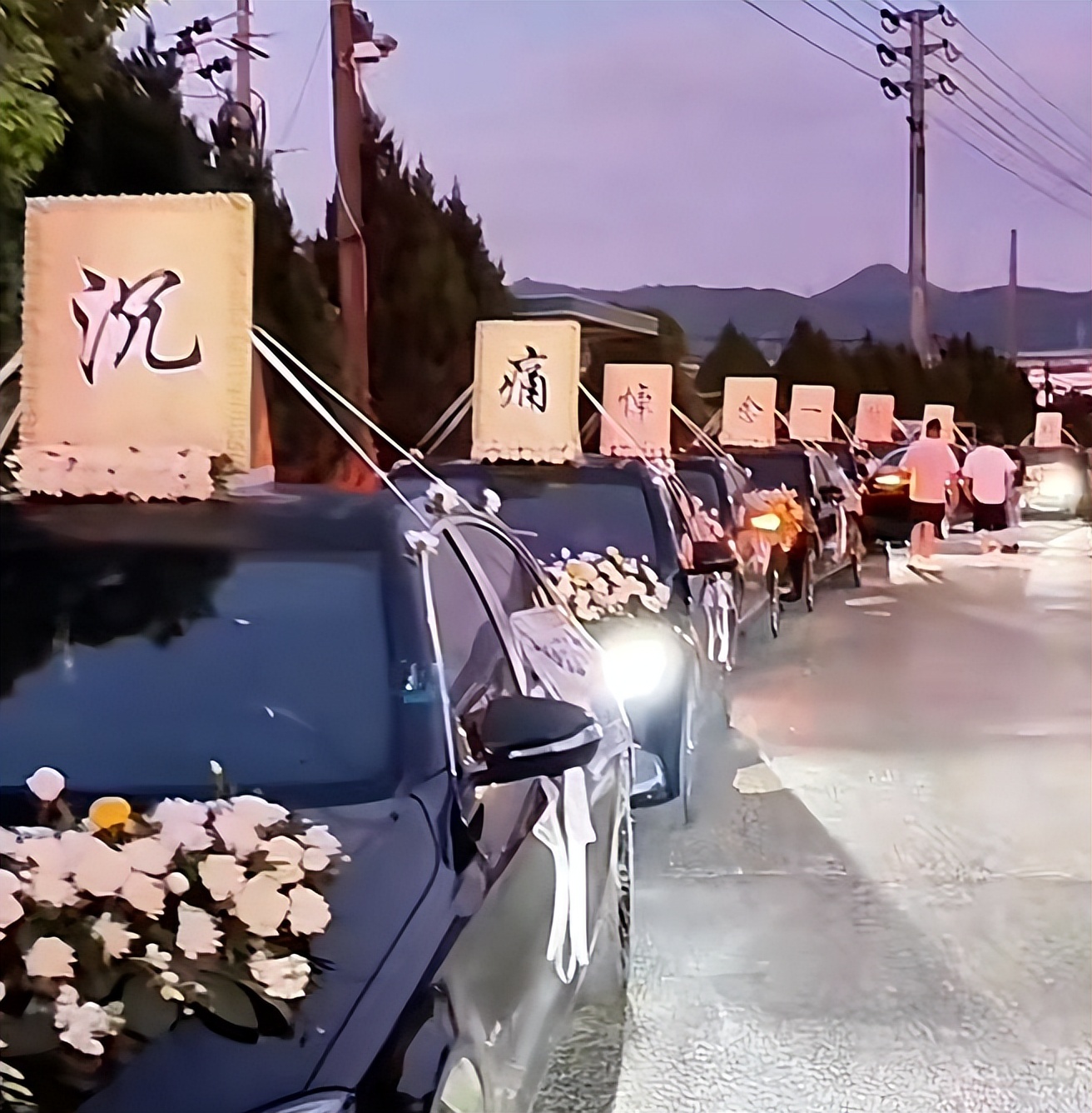 後面的十幾輛車上,車頂上也都有字,組合起來大概是「沉痛悼念孟再平老師」,盡顯心意。