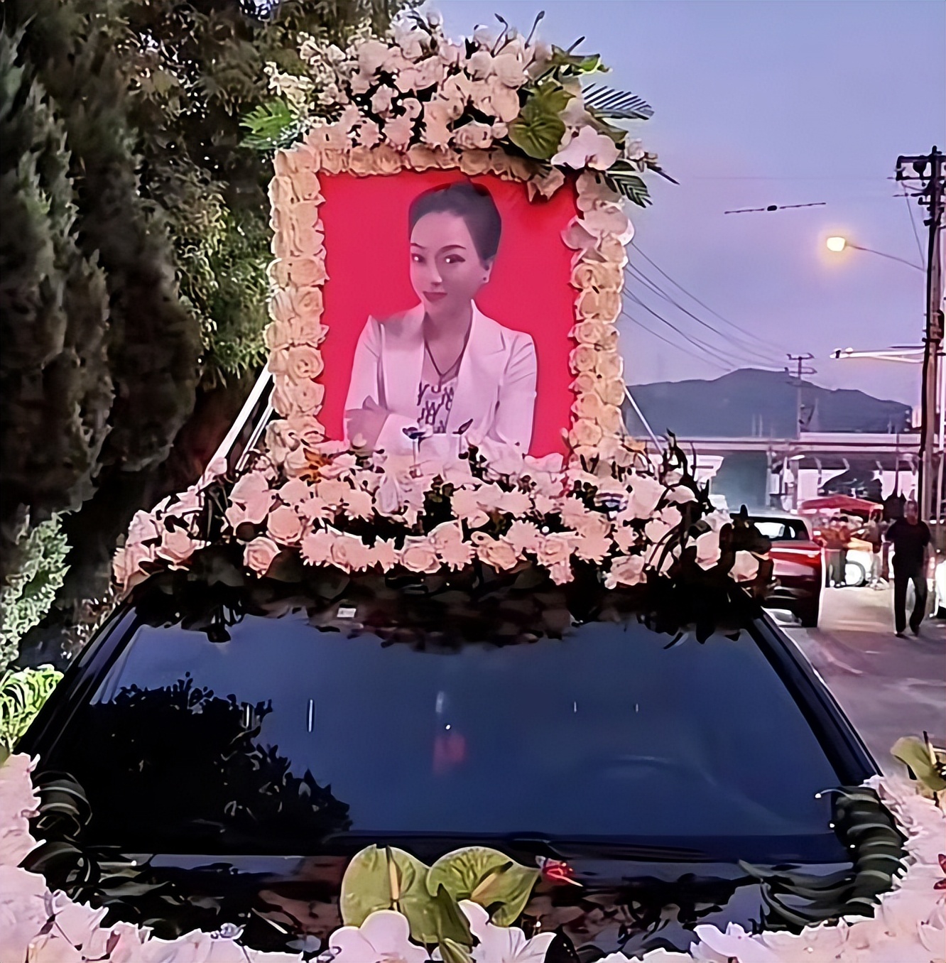 送葬的車輛都是邁巴赫、勞斯萊斯等豪車,頭車上放著孟再平的遺照,周圍鮮花圍繞,足見她老公的心意。