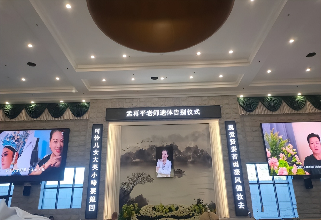 再看孟再平的靈堂,中間放著她的遺照,後面電子大螢幕上放著孟老師的越劇小生扮相,十分莊重有意義。
