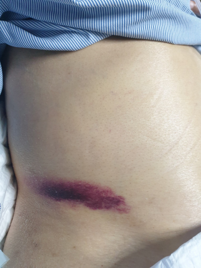 主治醫師在隔天查房時,意外發現病人右側腹股溝處出現長達15公分的瘀青,但病人並未遭受任何外力撞擊。醫療團隊立即進行一連串檢查,包括抽血和電腦斷層掃描,排除了急性胰臟炎和後腹腔出血等可能性。