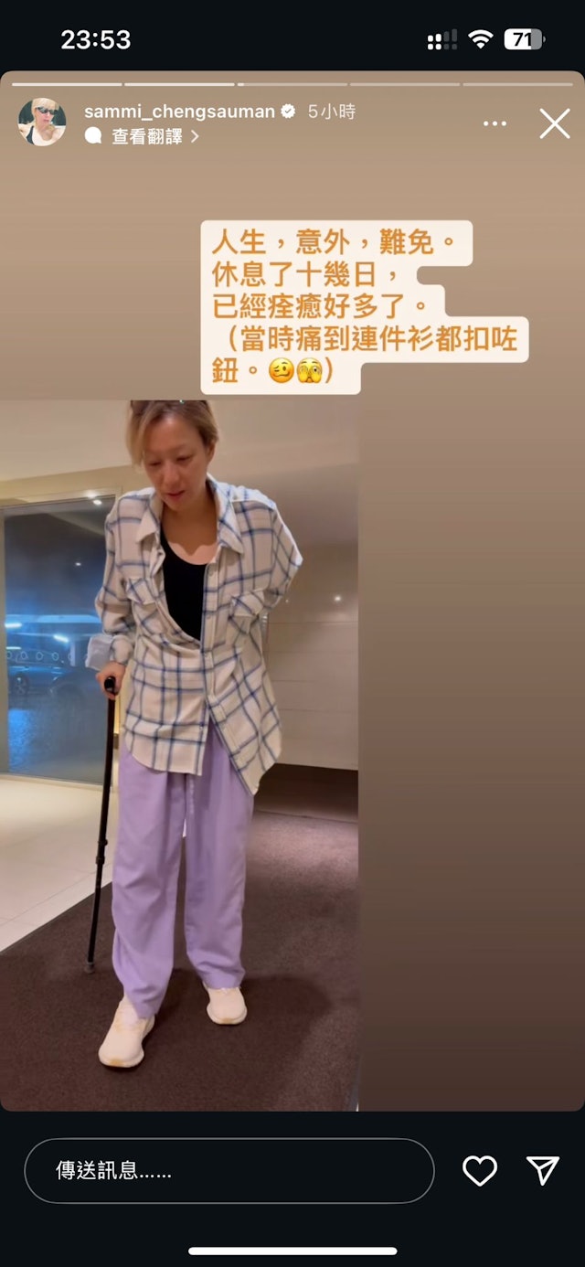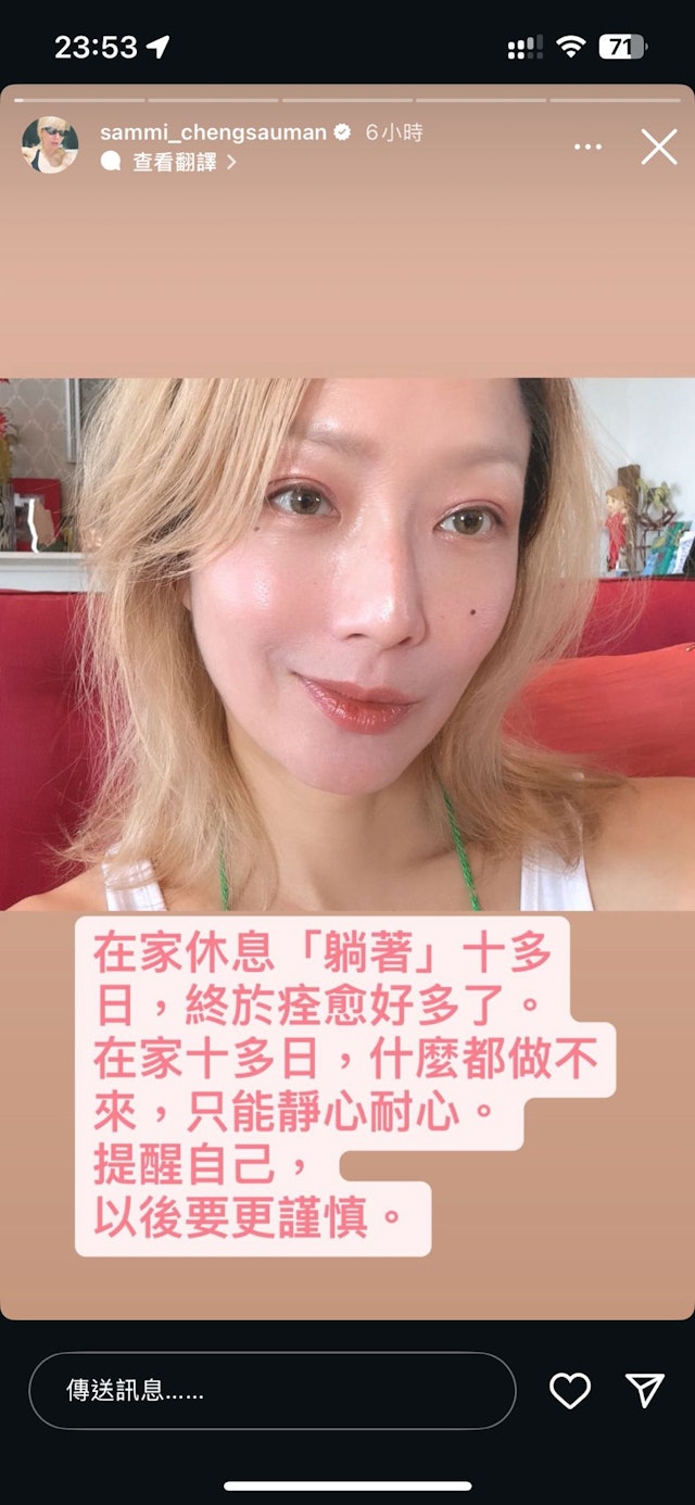 經歷這次意外,鄭秀文也感慨表示,未來一定要提醒自己別再過度勉強身體,要懂得適可而止。