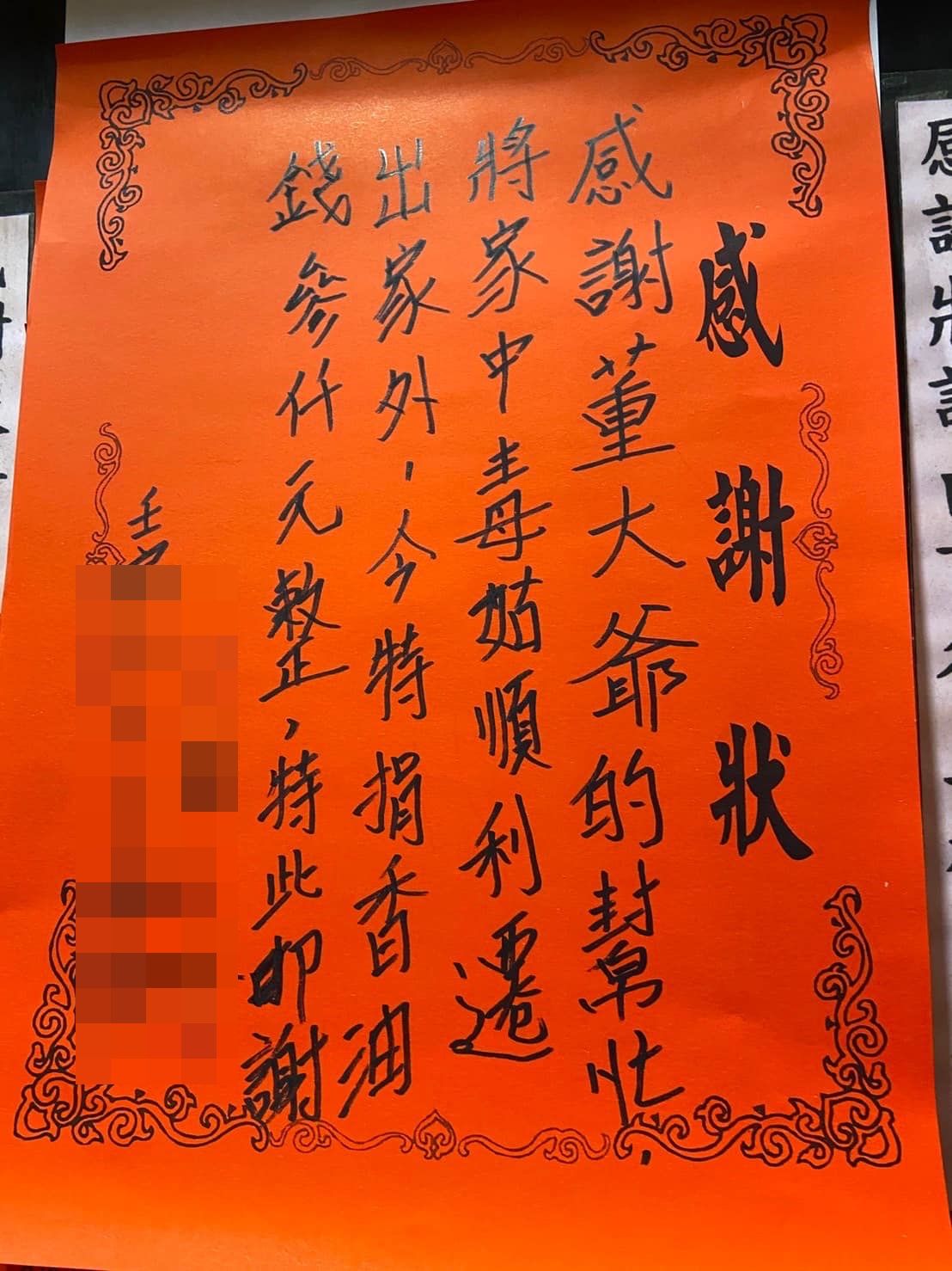 據《ETtoday》報導,有網友在臉書社團「毒菇九賤婆媳討論區」中,PO出一張照片,笑說自己雖然沒有毒菇(通常指惡毒的大姑、小姑)的困擾,不過看到這張感謝狀還是覺得非常有趣,只見該張紅色的感謝狀上面寫著:「感謝董大爺的幫忙,將家中毒菇順利遷出家外,今特捐香油錢叁仟元整,特此叩謝。」