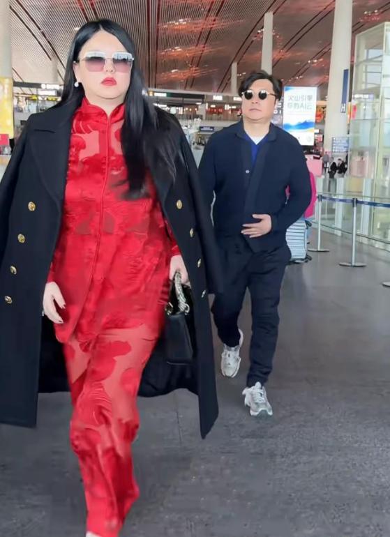 李湘穿著紅色中式套裝,外面披著一件大衣,拿著高奢包包霸氣歸來。