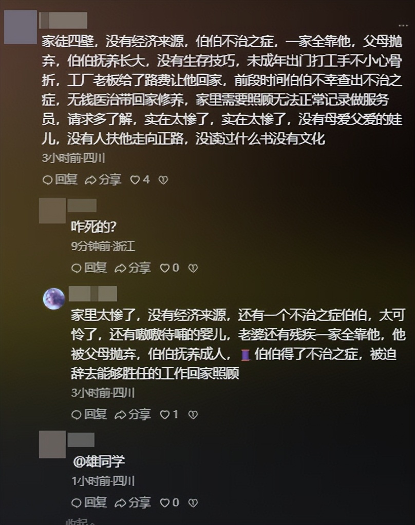 也有不少網友在評論區裡面證實,都說這個小伙的家庭非常的慘,除了有一個生病的伯伯,還有一個嗷嗷待哺的孩子,而且他的妻子也有一些問題。