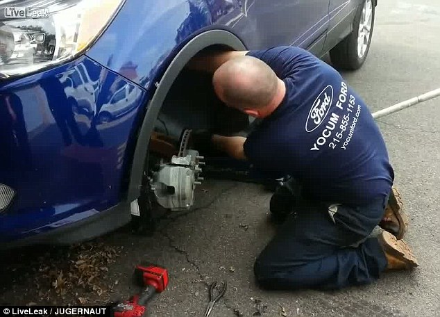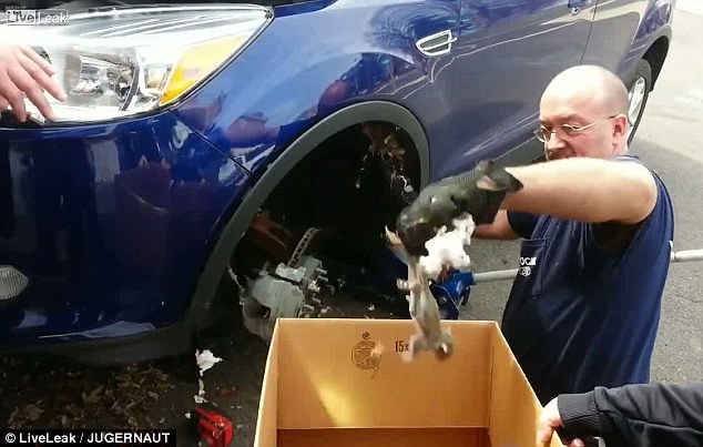 當專業人士把輪胎拆下來時,立刻就掉下許多的碎屑,隨後更發現了住在裡頭的松鼠們,因此他們趕緊把松鼠放進紙箱內。