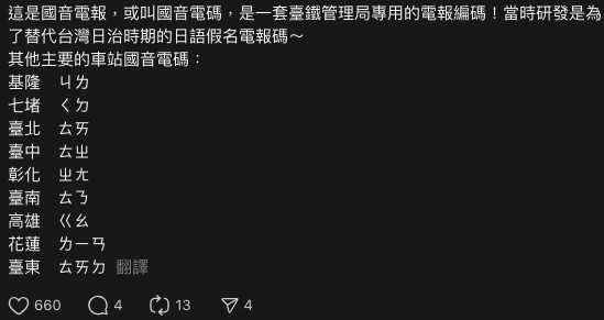 文章曝光後,有不少人打趣回應,「各位旅客您好,偷吃站快到了!要偷吃的旅客請準備下車,下車時,請注意感情間的縫隙」、「透ㄊㄡˋ抽ㄔㄡˉ,簡稱ㄊㄔ」、「貪吃站」、「明明就糖廠,我要吃冰」、「湯匙」。然而實際上,這組神祕的注音符號背後,藏著台灣鐵道獨特的通訊系統,也就是「國音電報」編碼系統。