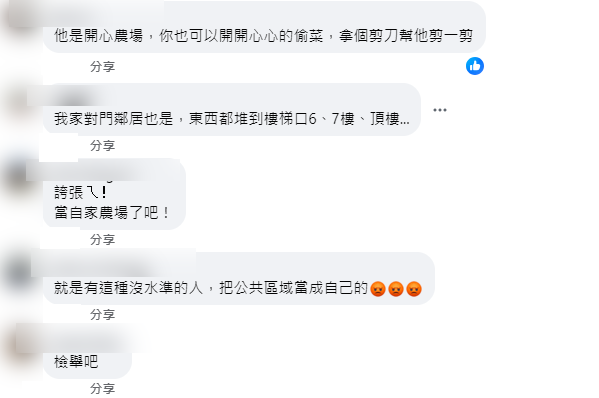 照片曝光以後,立刻掀起熱烈討論,網友紛紛表示「這太誇張了吧 」、「他是開心農場,你也可以開開心心偷菜,拿個剪刀幫他剪一剪 」、「就是有這種沒水準的人,把公共區域當成自己的 」 、「腦袋到底用來幹嘛的啊?都沒考慮到緊急情況的時候怎麼辦」。